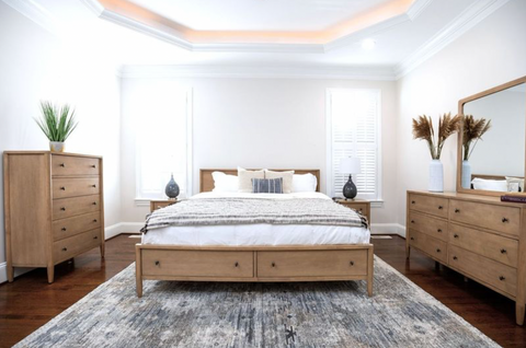 The Chatham Collection combines timeless elegance with thoughtful design. Finished in warm maple, the bed features a 45" headboard for ideal window clearance, complemented by soft return posts and dark pewter "cats eye" hardware. Felt-lined top drawers with jewelry trays, cedar-lined bottom drawers, and recessed side panels add luxurious touches. Nightstands offer modern convenience with USB/USB-C ports. A perfect blend of beauty, comfort, and practicality for any bedroom.