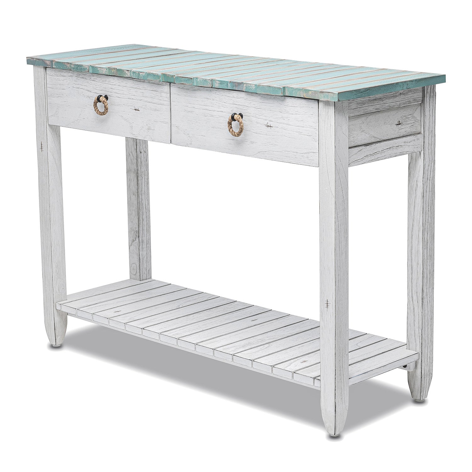 The Picket Fence Console Table is a stunning piece of furniture that will elevate any space. Featuring a distressed finish and natural rope pulls, this table is made with kiln-dried, solid Mindi Wood and White Cedar, ensuring its beauty and durability. Dovetail drawers provide added storage while full extension ball bearing drawer glides make opening and closing easy. Transform your entryway with this timeless piece.