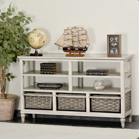 This Island Breeze Living Room collection features woven baskets, inset glass that sits above the woven top, and is complemented by a slightly distressed finish on the solid frames that gives these pieces a unique casual and tropical flair.