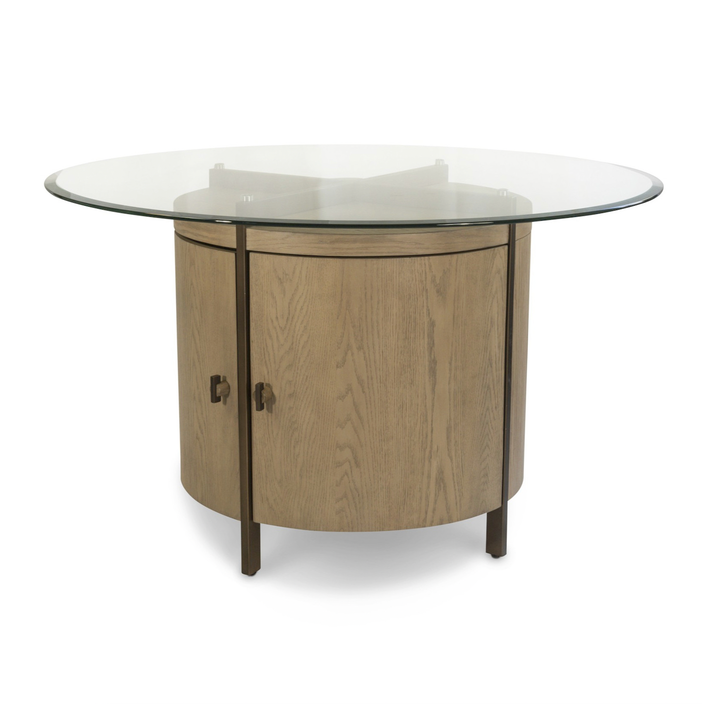 Round table in a White Oak with a cathedral cut with muted tones and a clay finish. Hardware features a powder coated bar hardware fitted into a split dowel. Full powder coasted bronze metal X frame with a floating 54" round top. Levelers on all feet and top.